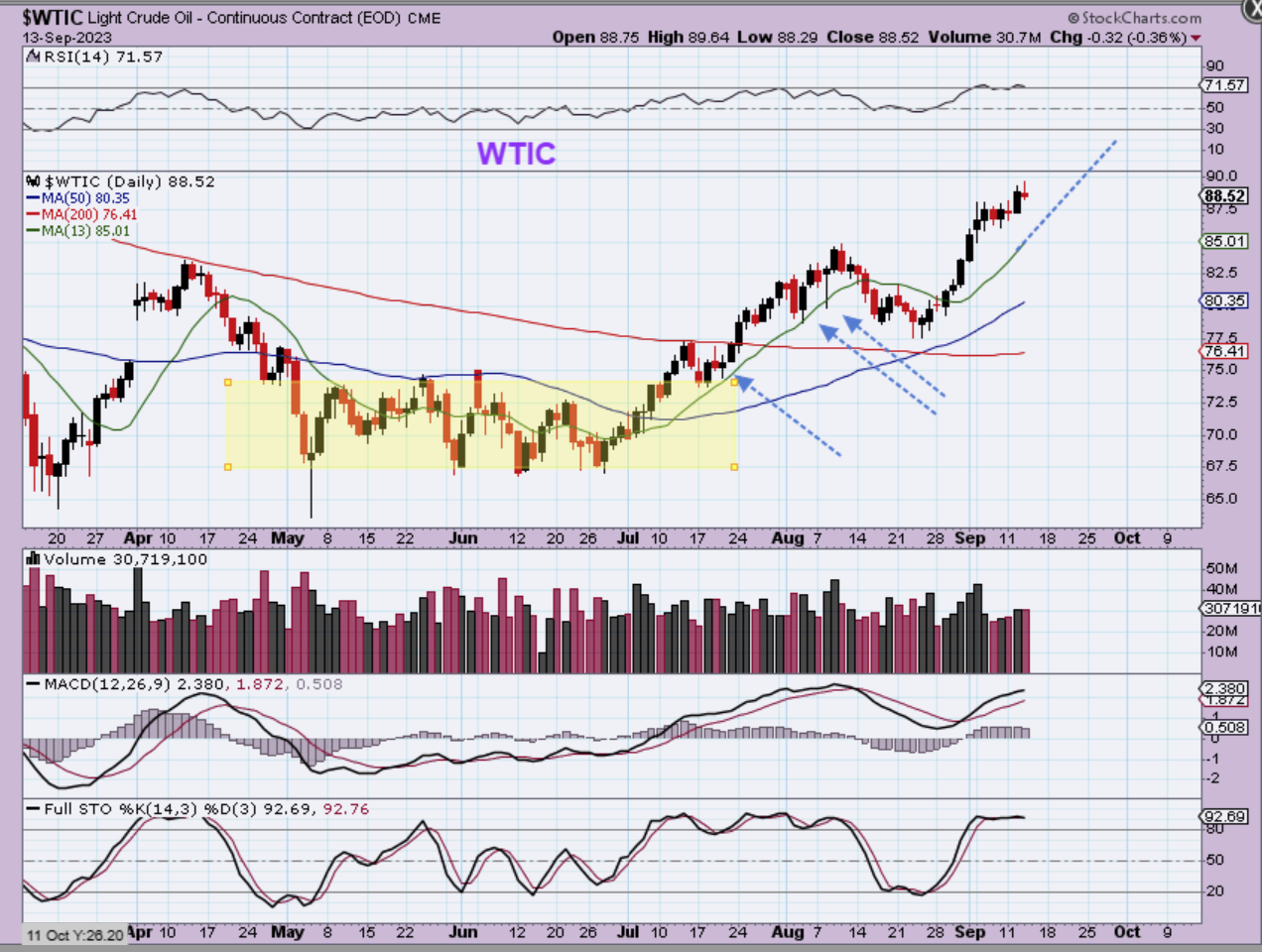 So while we are currently waiting for a break out higher over the 50sma or a more pronounced drop, it does not seem unlikely that we would drop into an ICL in September maybe even into the month of October. We have seen weak September – October time periods in the past. Again, it would likely drop to the 200sma area as an ICL. I have been saying that MSFT, AMZN, GOOG, CVNA, CRM, and other stocks that I watch do look bullish though, so we’ll see what jobless claims and PPI Numbers do for the markets.