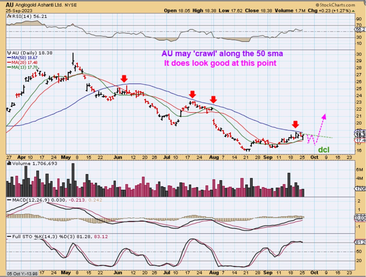 AU reversed at the 13 & 20sma and is crawling along under the 50sma. It may chop and drop this week while Gold, Silver, and the Miners seek out the dcl, but it is does look to be doing a bullish crawl.