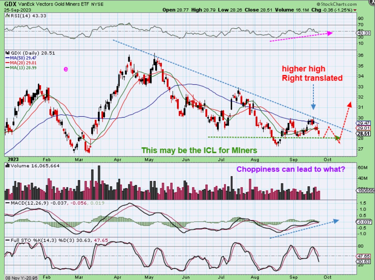 The GDX ETF is showing that some Miners are leading Gold or are stronger than gold, because it looks to have an ICL. Why? This is due to the fact that The GDX has made a slightly higher high and gives us a right translated daily cycle so far. If that is the case, then the GDX actually should put in a higher low next. That may be why some Gold stocks are bullishly aligned already. For example…