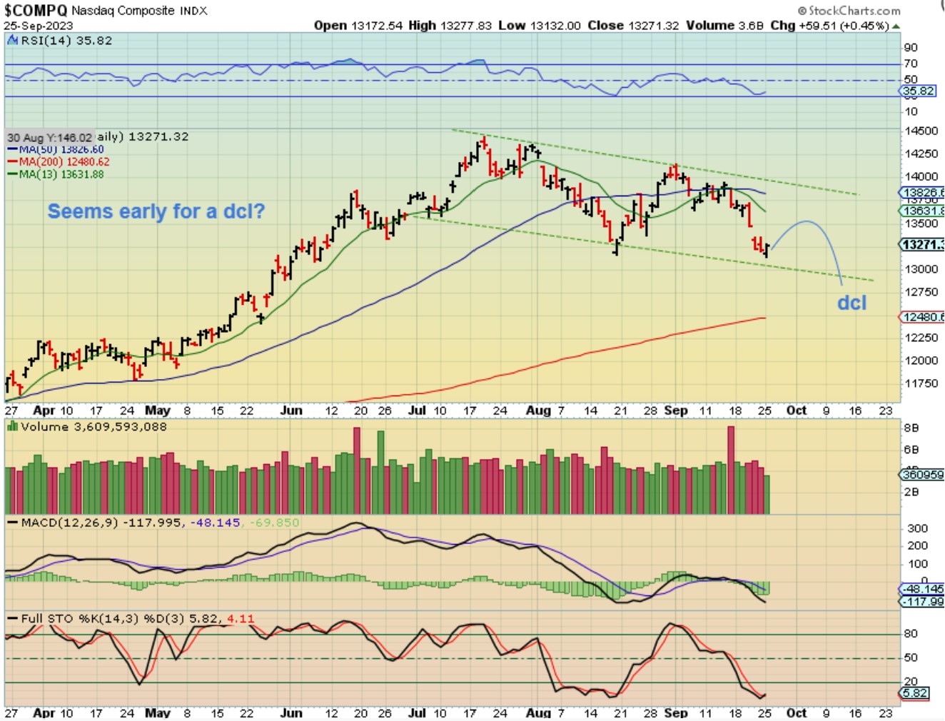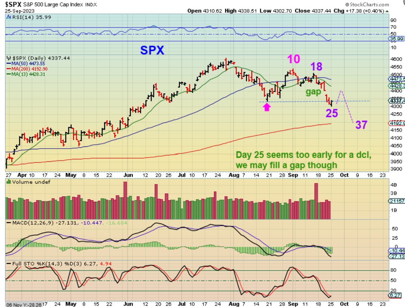 SPX – The general markets put in a reversal on day 25. Is that a dcl? It just seems too early, and sometimes these daily cycles have lasted for 40+ days, so I would say we do not have a dcl. We may see a bounce as a 1/2 cycle low, to fill that overhead gap and then continue lower in my opinion.