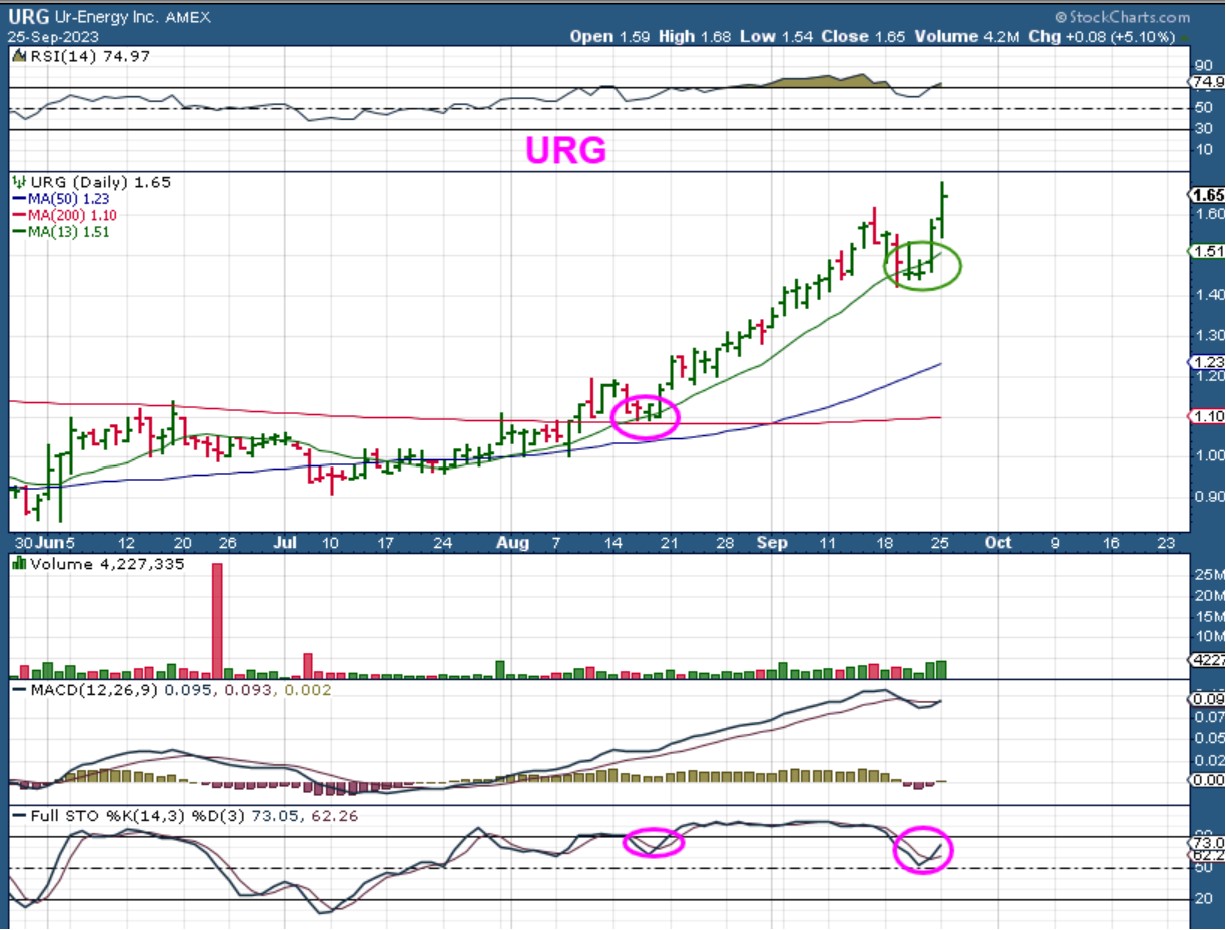 URG rallied out of the lows. Many of these dipped last week to the 13 sma and reversed on Friday as a ‘buy the dip’ set up. Where might this be running too?…