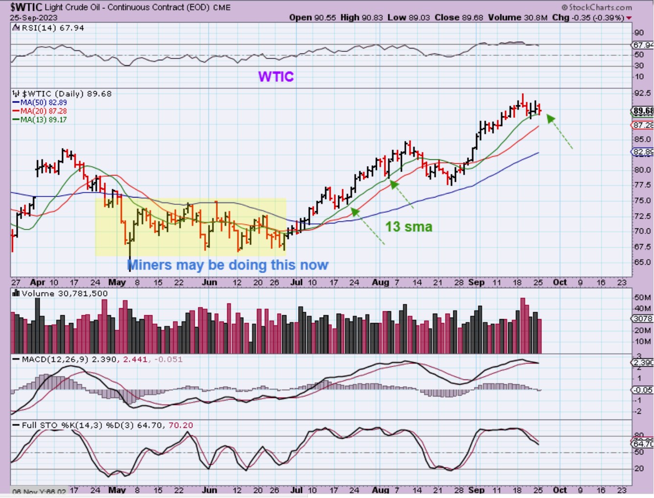 WTIC – Oil has been choppy and in that first run it only dropped to the green 13 sma. It may do that here, or it may pull back more than that, we really just can’t tell what the ‘wiggles’ will be, but Oil has been strong after putting in that choppy bottom. Please read the chart.