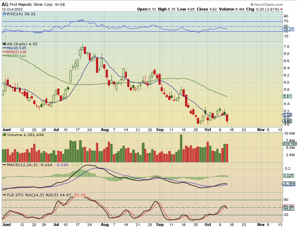 AG – Silver stocks have not really begun to move higher with zeal, they are chopping along the bottom. That makes them harder to hold with a swing low in the USD, because they could possibly break the lows. Yesterday I wrote about FSM, AG, HL, etc as Silver miners that may be ready to join the run higher, but with the USD putting in a swing low, they are showing signs of bottoming process, rather than rallying. At this point, I would have to say that they may need more time.