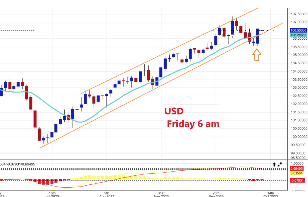 THE USD surged yesterday with a strong reversal and this will likely become a dcl. This chart was collected at 6 am today and the USD has a small candle there and it is green, but that is not stopping Gold from pushing higher today…