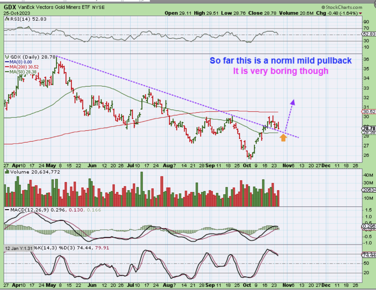Gold was up yesterday with that possible pennant formation, so it was disappointing to see The Miners, or GDX down 1.64%, but it is still a mild normal dip. One more day of this could give us a back test of both that trend line and the 50sma. I have mentioned that we could back test the 50sma from the start of this drop, so this is not abnormal price action at all.