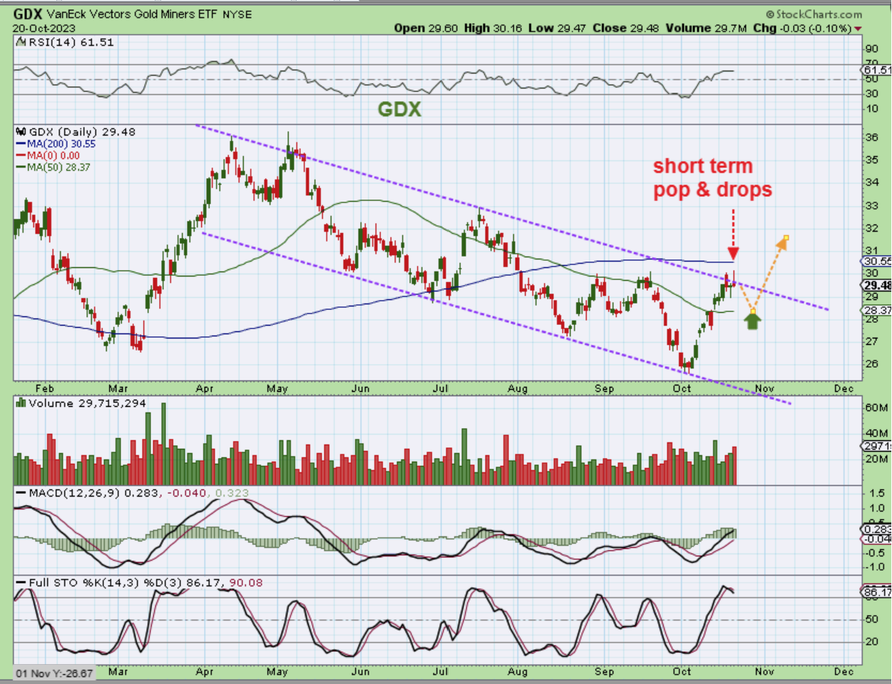 THE GDX ETF reversed at the bottom of the channel as an ICL and then broke through the 50sma. It was heading for the 200sma, but it has popped and dropped twice as it reached that channels’ upper trend line along the way this week. I have drawn a back test of the 50sma as a 1/2 cycle low possibility, and then I’d expect a breakout above the 200sma.