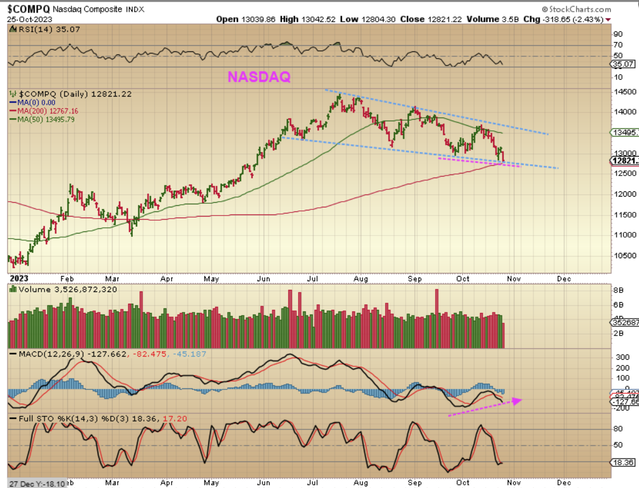 The NASDAQ dropped on Wednesday and we broke to a new low where the Nasdaq is finally down at the 200sma. You could look at this as a 5 wave drop ( 1-2-3-4-5) and today we have the jobless claims report being released at 8:30. We’ll see if that turns things around and leaves behind an ICL (a meaningful lasting Low). I usually like to see wave 3 much longer than wave 1, but in this case we are simply due for a reversal.