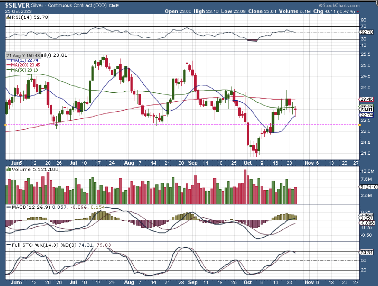 SILVER had a nice run after a ‘shakeout’, but it does lag Gold a little and it is stuck under the 200sma and is now also under the 50sma. Yesterday it bounced off of the 13 sma, so it is trying to hold up so far as a mid-point consolidation.
