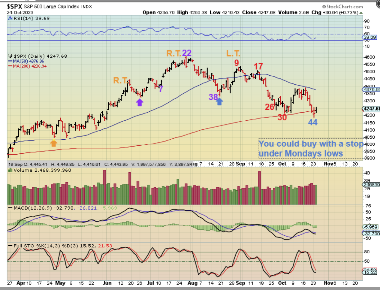 SPX – Now likely on day 46, we have the release of Jobless claims. In the past the markets have rallied with the jobless claims, since the economy and work force seemed strong, so we’ll see if that puts in a low or not. I will note that last week the markets dropped on Thursday and Friday. PLEASE READ THE CHART.