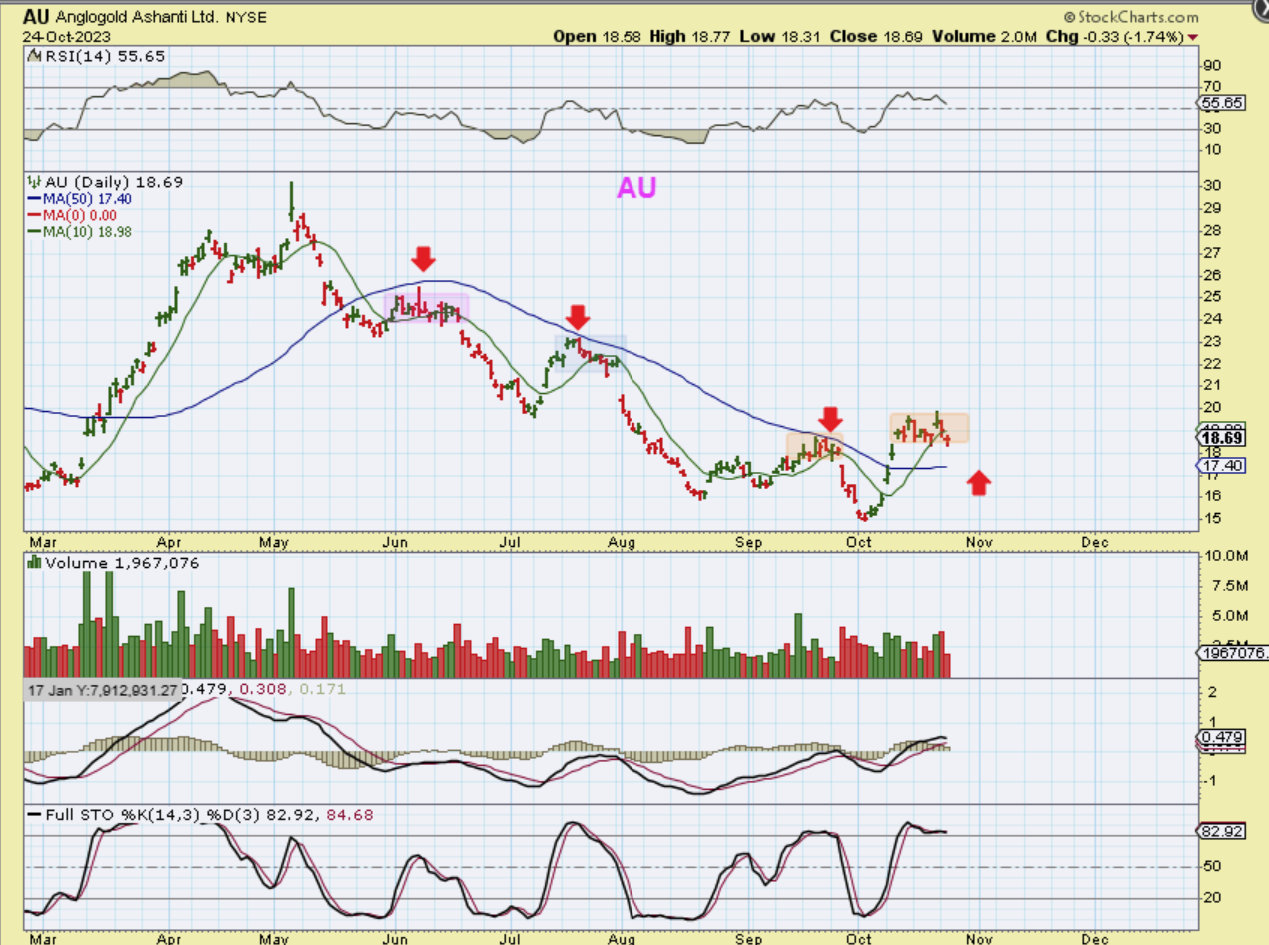 AU ran strong and it has simply been chopping sideways over toward the 10sma, but it often ran up to the 50sma and then dropped, a drop there seems possible and would be a buy if it reverses there as support.