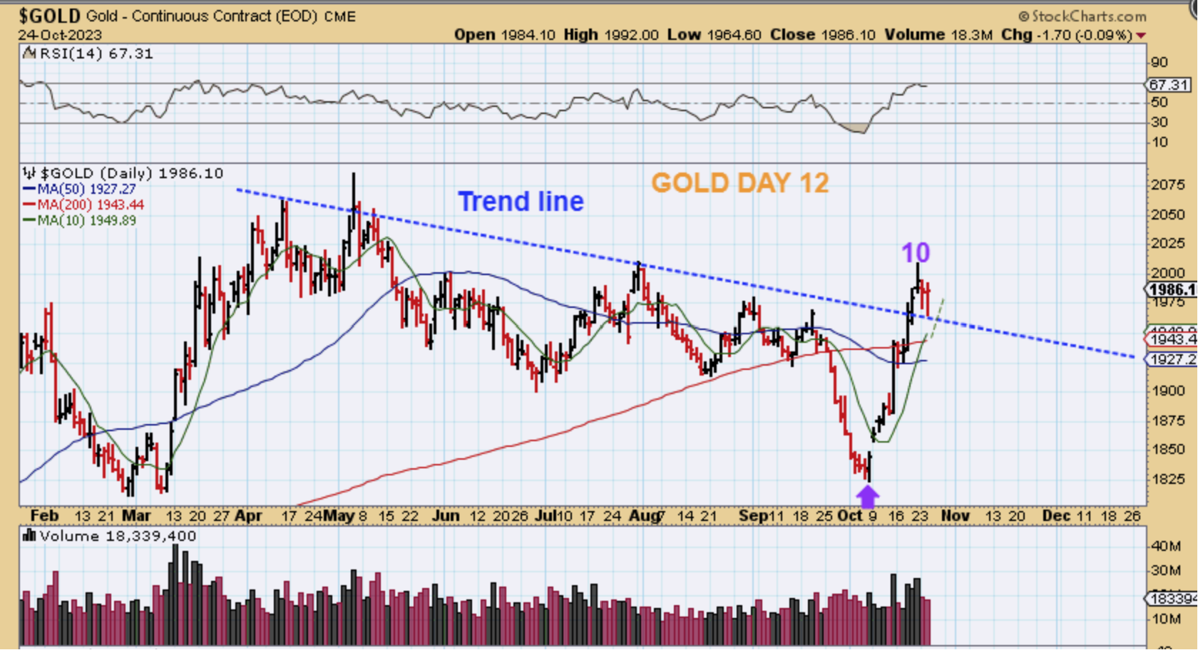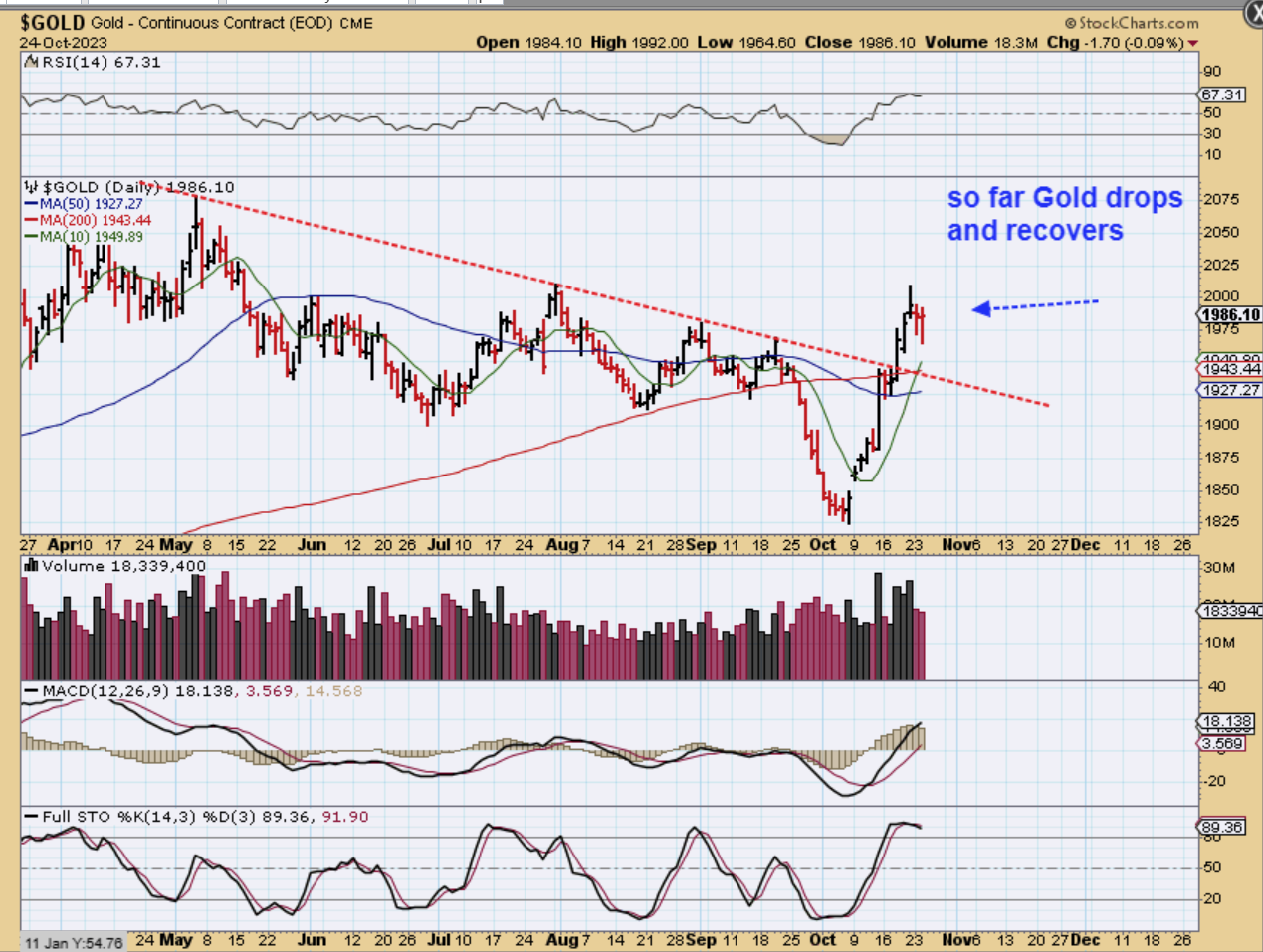 Take a look at this chart of Gold: I drew this trend line from the last several ‘peaks’ and a tag of that trend line and 50 & 200sma below seem to be likely targets, but this next chart was interesting too…