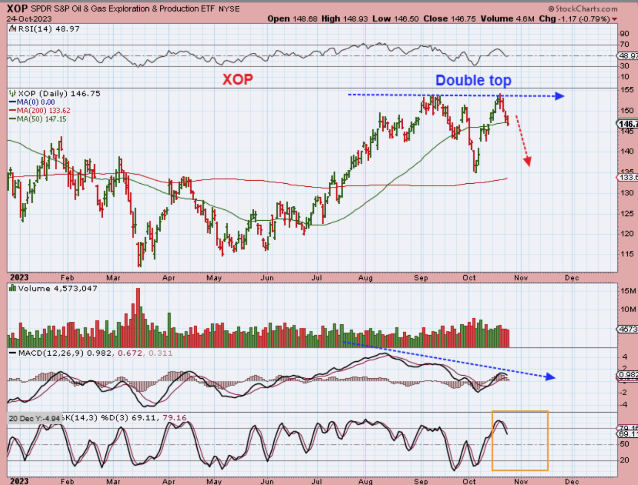 THE XOP looks like it is now a double top with negative MACD divergence. Yes, it dipped to the 50sma and that looks ok, but with Oil breaking down I think that it is more likely that this will continue lower too.