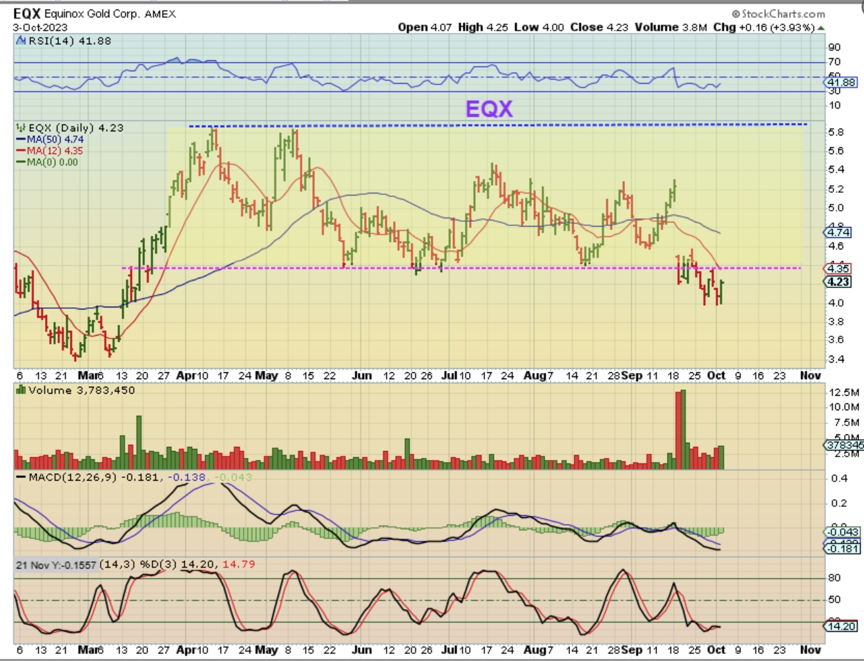 EQX is likely putting in a low, since it stopped dropping and started chopping as Gold approached day 30.