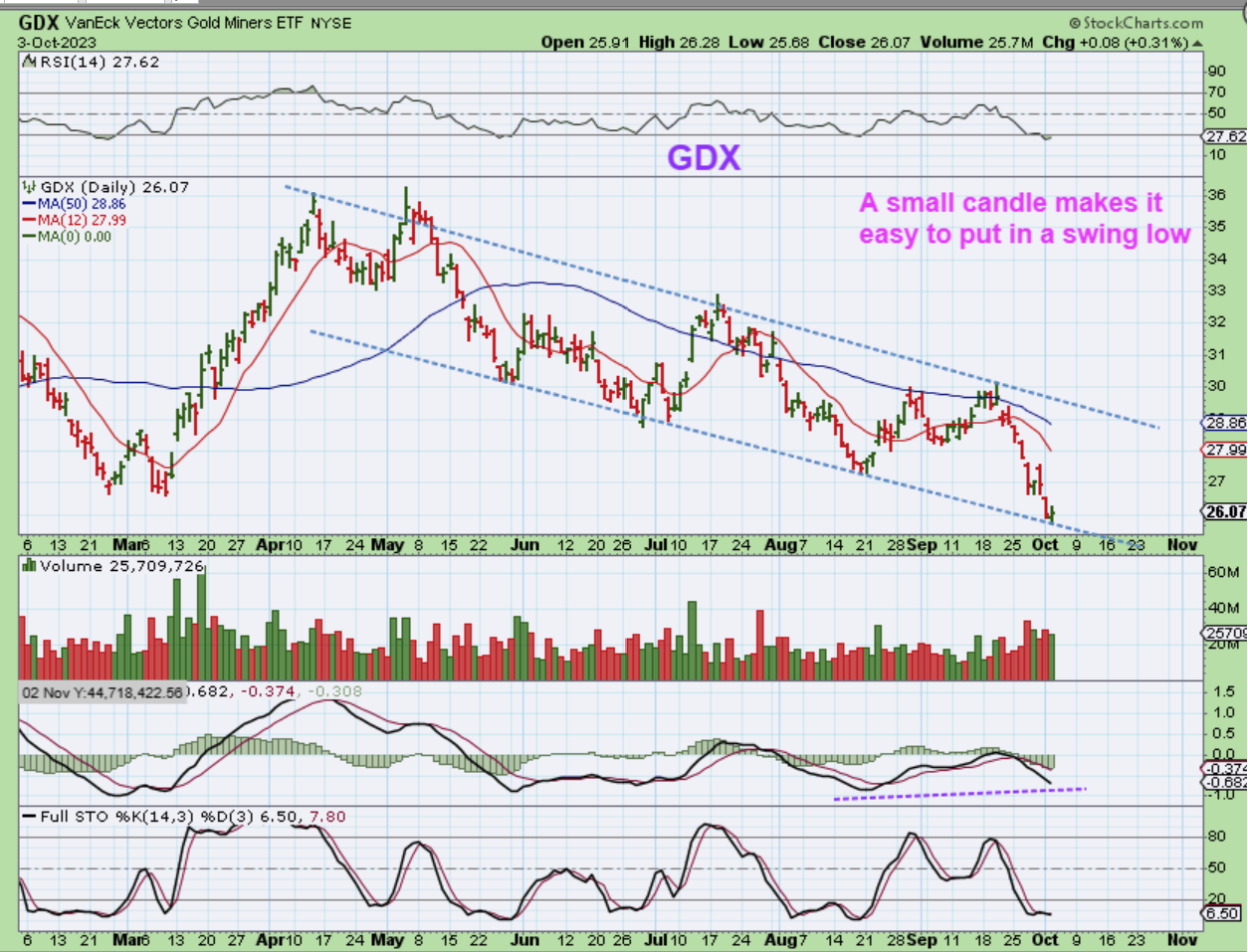 GDX – Last Thursday we had a reversal candle just like the one that formed on Tuesday, and those lows fell apart, so we have to keep that in mind. This small candle also allows us to easily get a swing low in place if price moves above $26.28.  The hard part is that we usually wait for price to close above the 10sma. (I accidentally have the 12sma here, so please see next chart)…