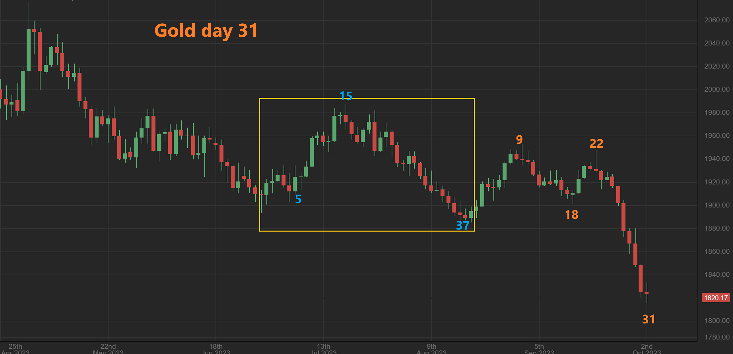 So while The USD was rising higher, GOLD didn’t continue to drop. It paused and put in a small doji candle at day 31. That small candle can shorten the parameters for a swing low to form and since DCLs come around day 32, this very well might be the lows. Waiting for a little follow thorough higher is the safer way to proceed.