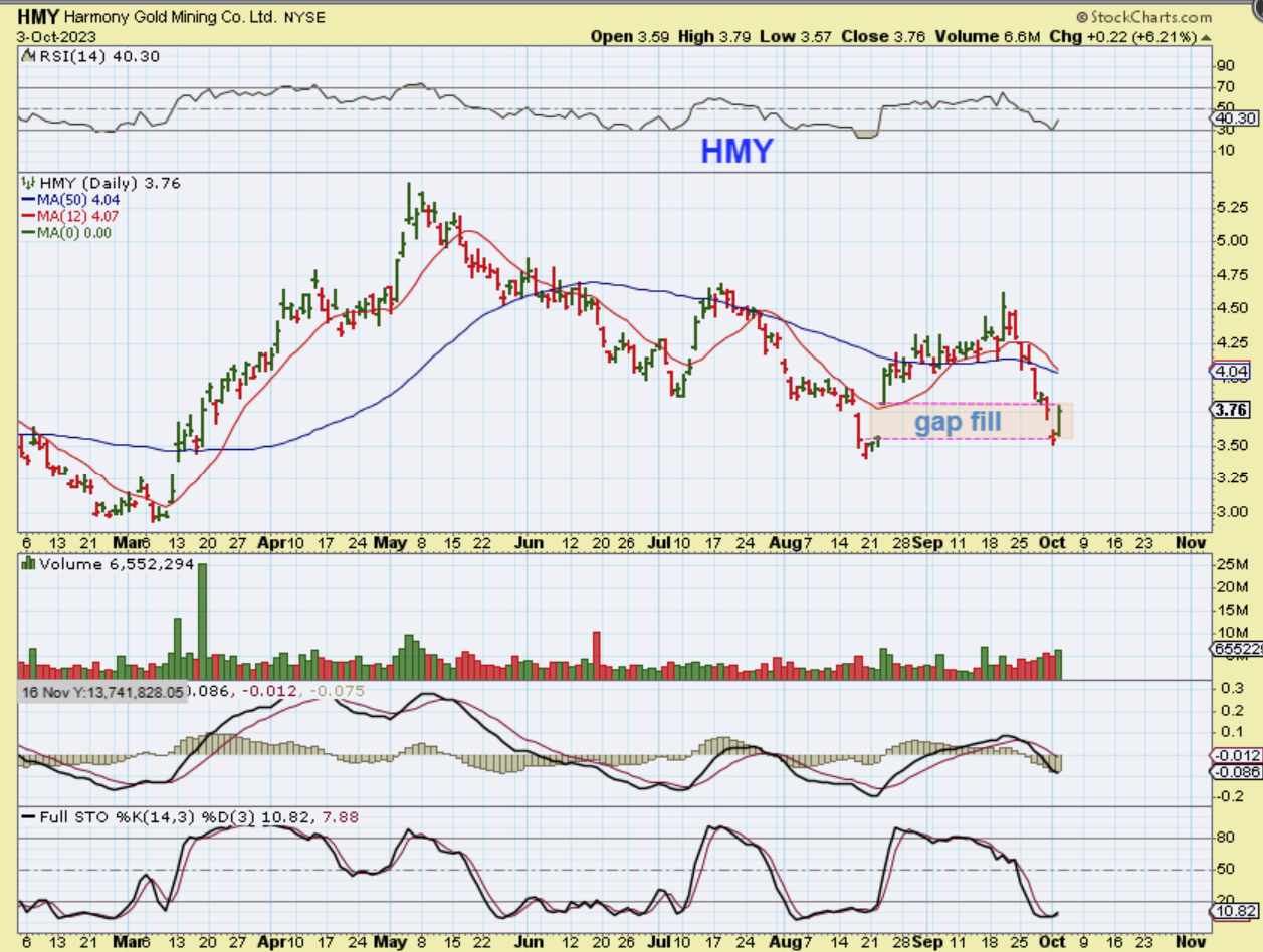 HMY has a swing low and was up 6.21%. It dropped all the way down to fill that gap & then reversed on Monday. In March, June, and August, the rally out of the low was profitable quickly, so I like HMY as a ‘trade’ at dcls, or ‘buy & hold’ when we have an ICL.