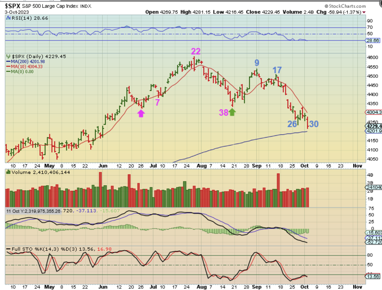 So now with The SPX we closed down near the 200sma, but I have been thinking that we will do a shakeout and break below that 200sma. We are only on day 30, the last daily cycle was 38 days, and they can run longer than 40, so this may have further to go.