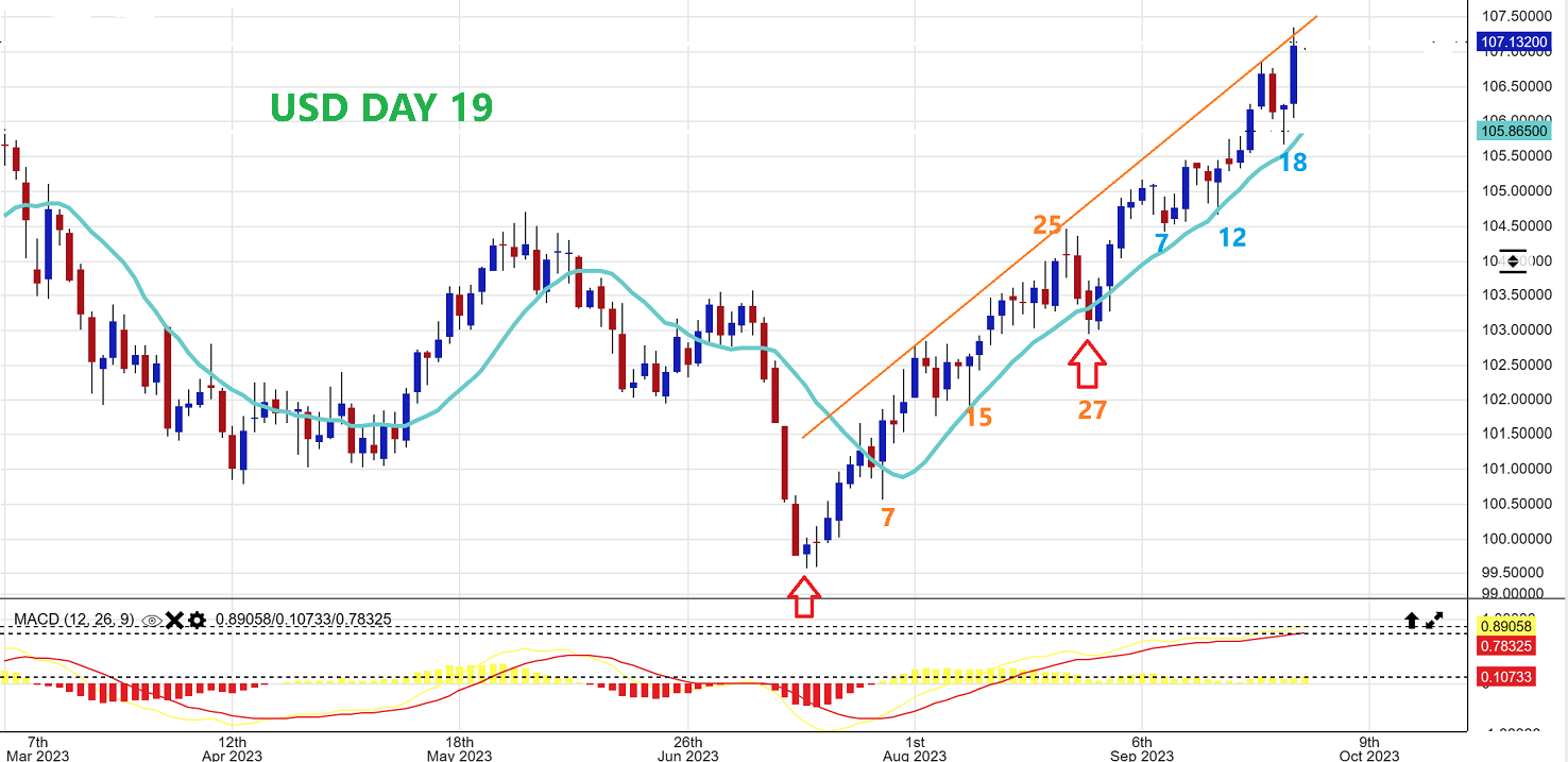 2. We are now on day 19, so this upper resistance may held to drop the USD down into its next dcl.