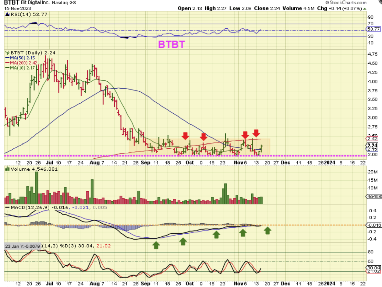 BTBT released earnings 2 days ago at the lows and has pushed higher for the last 2 days in a row. This is a flat bottomed base and an easy buy & hold, since the lows at $2.00 represent a nice stop. I did buy a position in this just to hold and watch it.