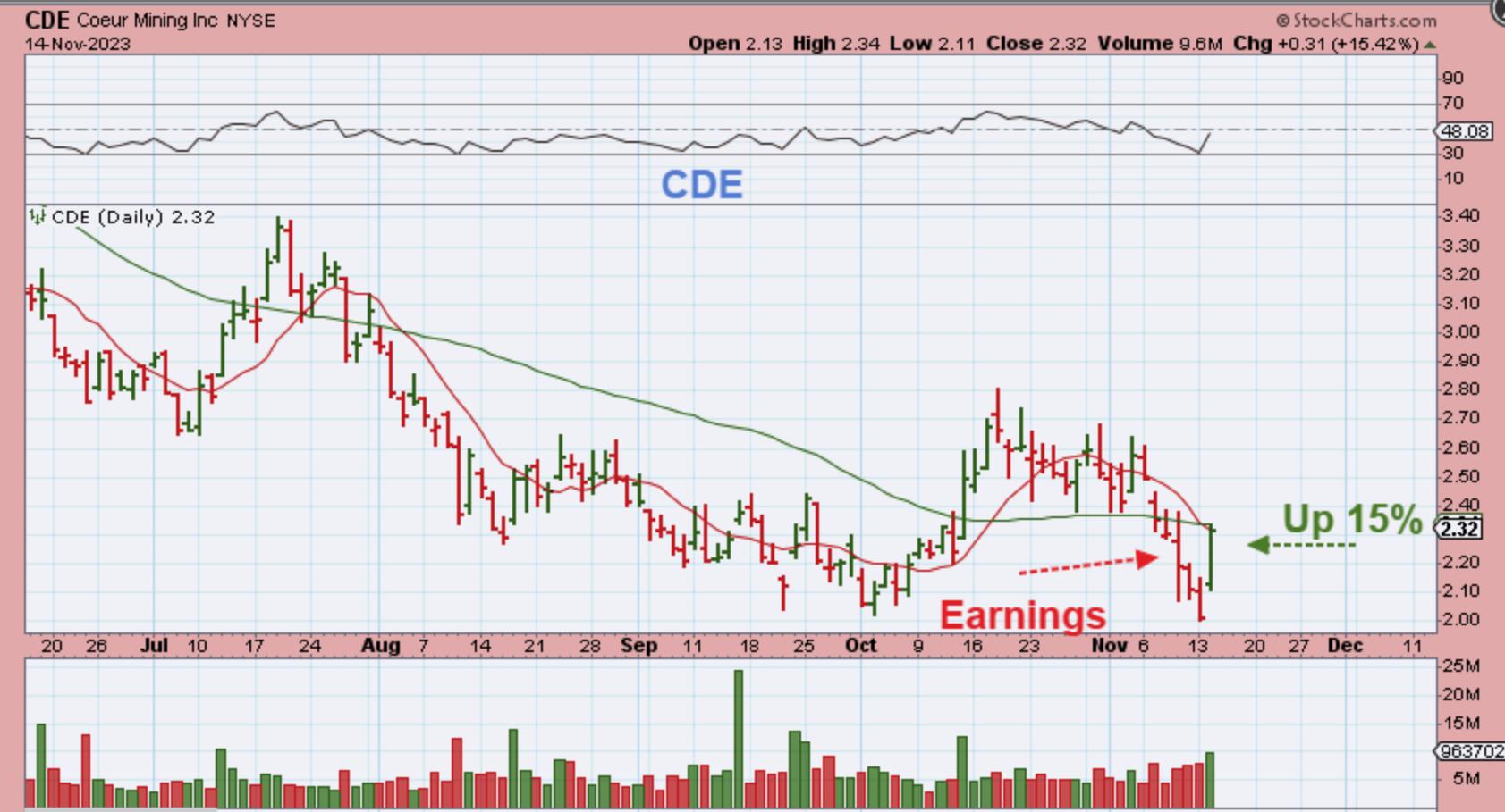 I wanted to point out that many Silver stocks crashed after they released their earnings, but those losses have already been erased. So with Silver miners like CDE,  I feel that this is a bullish development as they start to recover with Silver.
