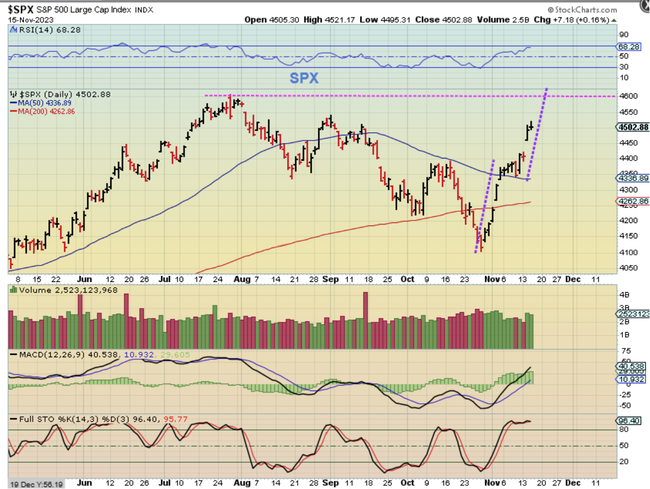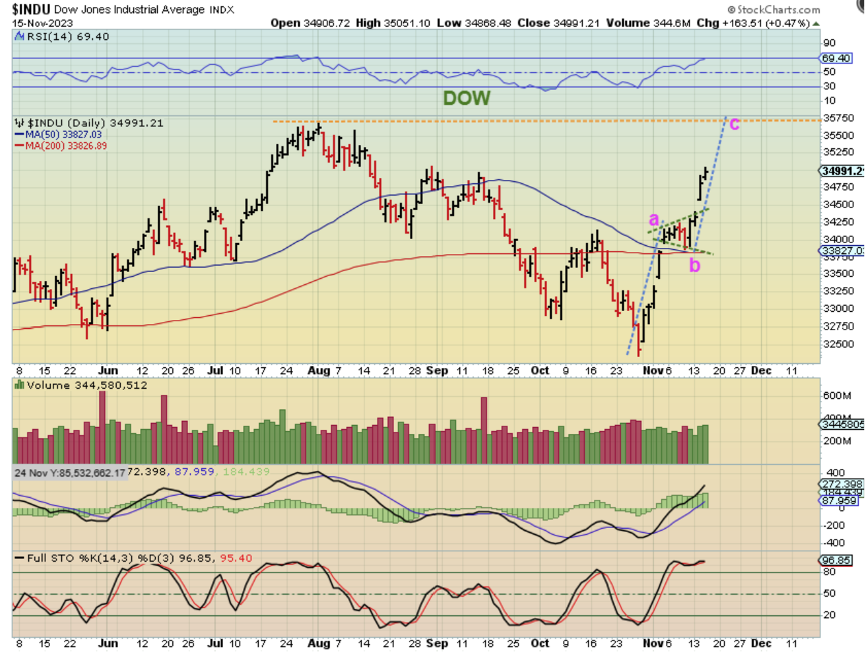 Nov 1st was the Fed mtg. I remember that I flipped on CNBC to see the decision as it came in and I saw an analyst say that the Dow is extremely bearish since it looks like a bear cross (50 under 200sma) was about to take place. He warned everyone that it pointed to a recession no matter what the fed did, and gave a ‘sell’ or ‘go short’ due that coming 50/200 cross. At the same time, I was already saying that we should have an ICL and a Buy. Now it looks like a midpoint triangle formed at the 50 & 200sma, and it also wants to run to prior highs, so we had and have a very nice bullish set up. Cycles really do give us a little help with the ‘timing’.