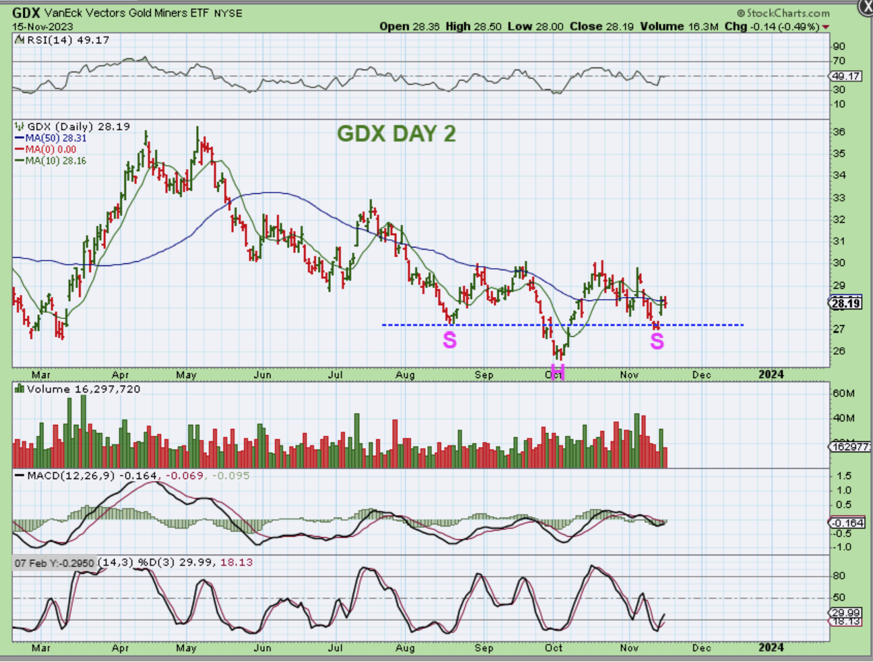 GDX or the Miners paused yesterday. This really should be day 2 of a 2nd daily cycle and this looks like an inverse H&S that will eventually run higher. We do have a gap and a gap fill and reversal would be a buy opportunity again, but this might just push higher from here.