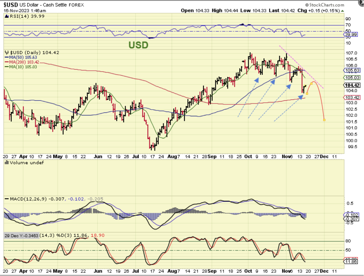 With the USD, I have discussed the sharp drop and bounces that followed, but the USD should be rolling over.  I said yesterday: