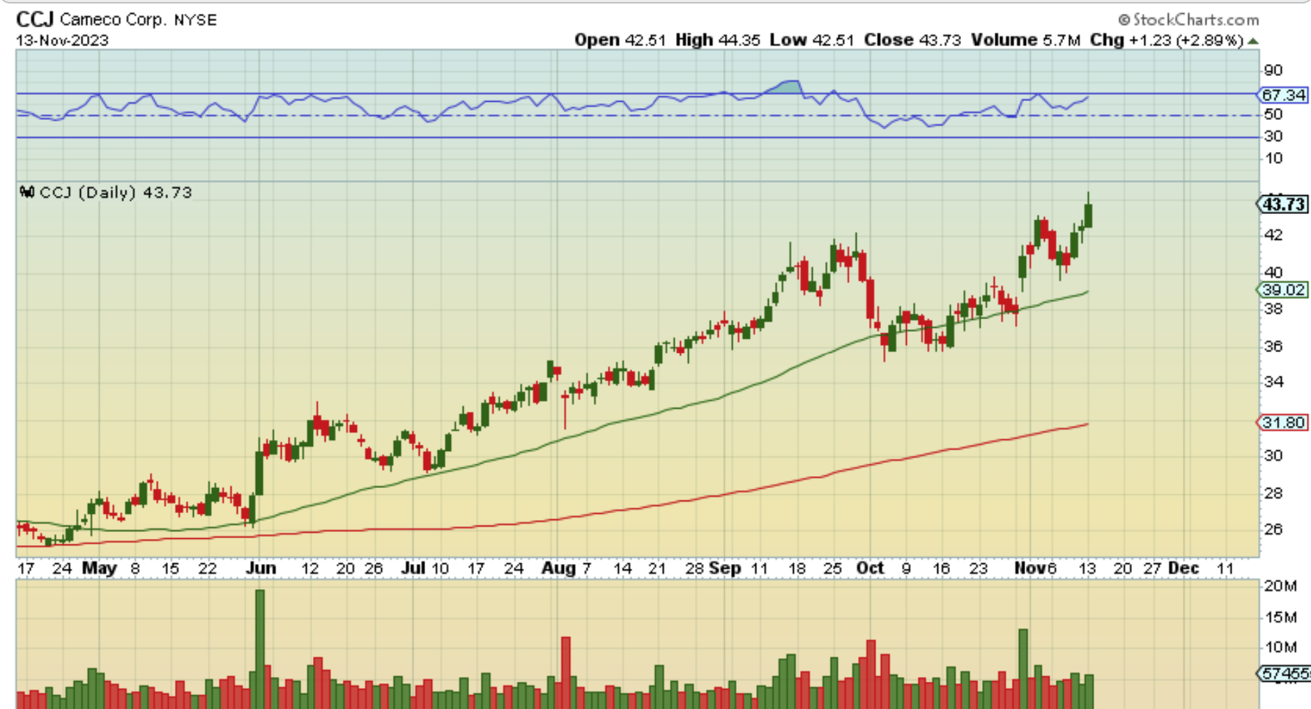 CCJ & UEC are leaders, since they are already breaking to new highs, and DNN, URG, UROY, etc are all also bullishly set up forming cup-like patterns.