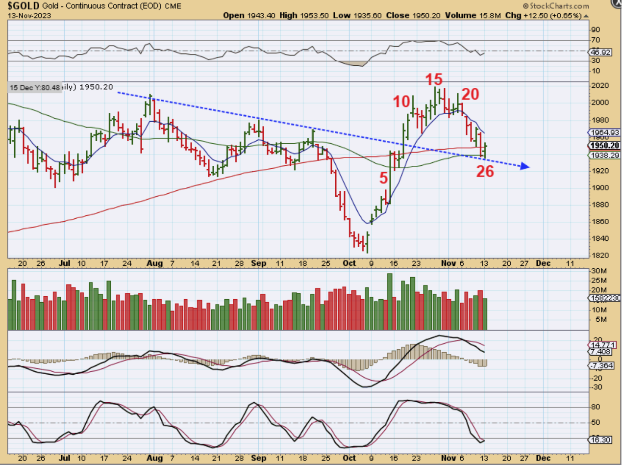 GOLD – So I Expected a dcl this week, and you may recall that I drew a ‘T’ bottom, thinking that maybe we’d make a new low this week, but reverse shortly after that. Again, on Monday…