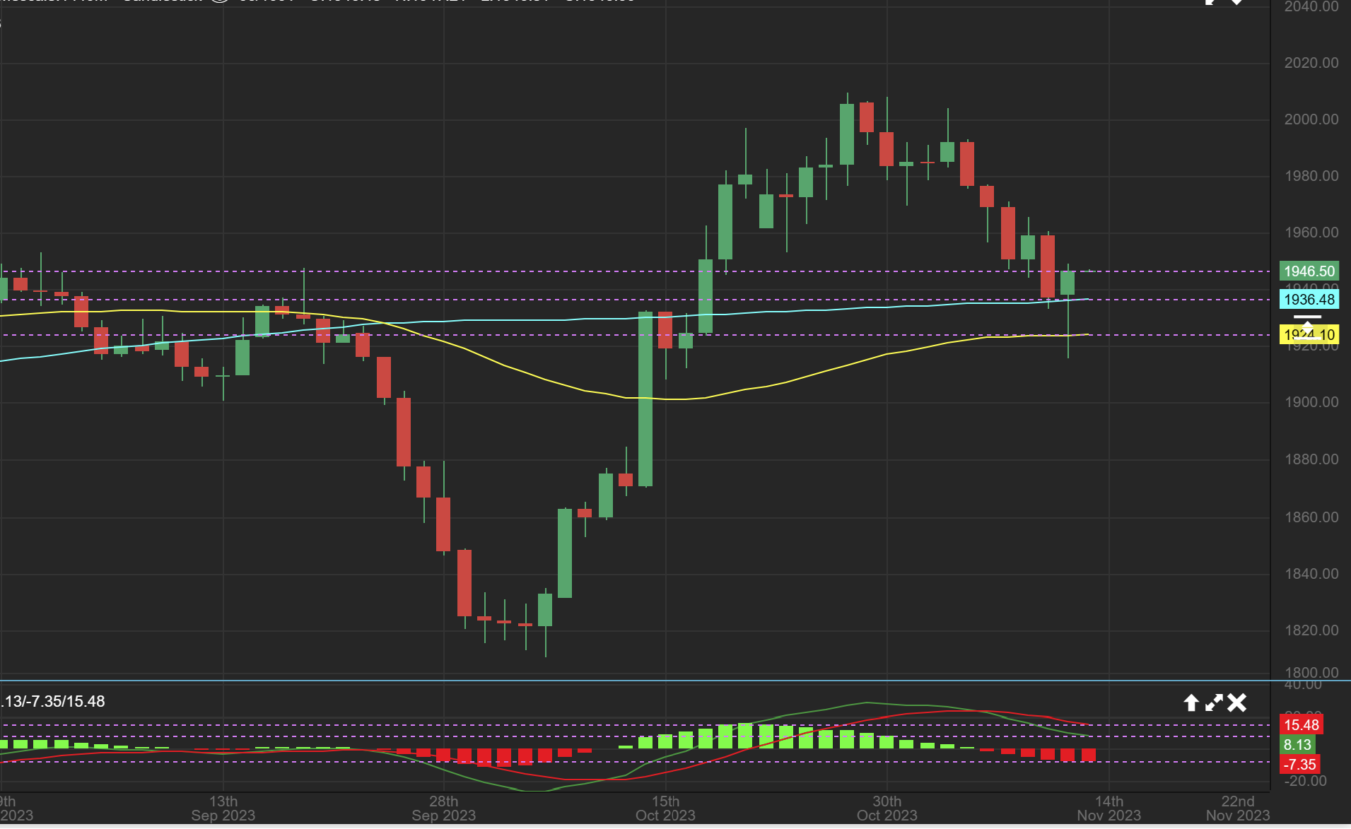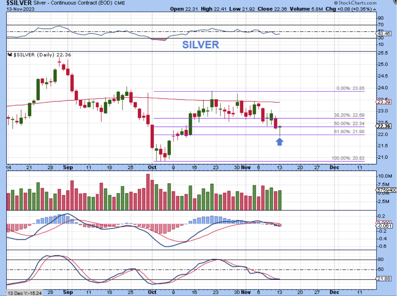 GOLD did drop to a new low at $1915, slightly breaking below the 50sma and recovering with a solid looking reversal candle. This action would give us that ‘T’ that I mentioned if it holds as the lows this week.