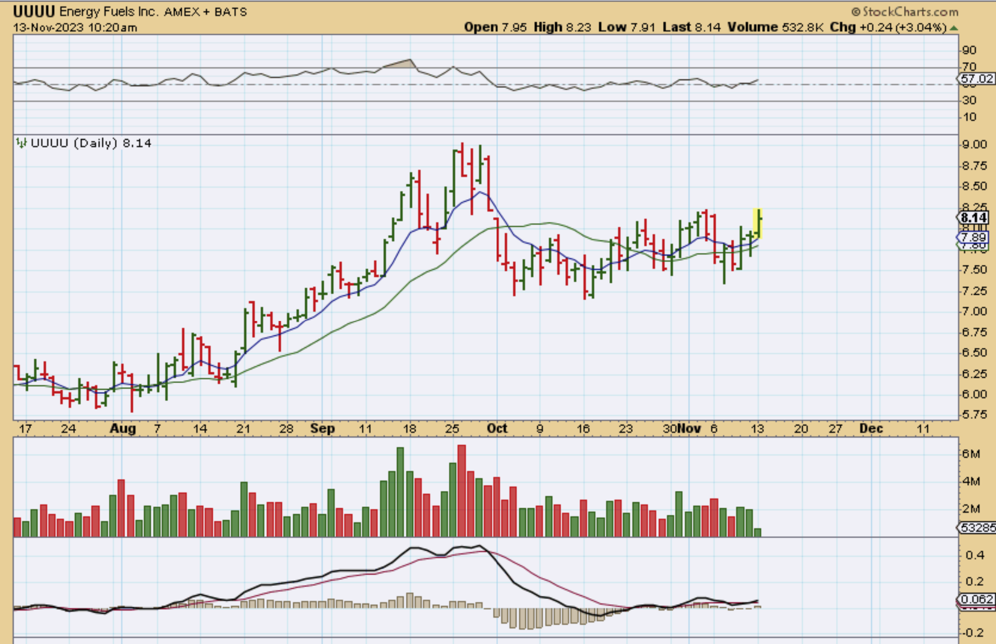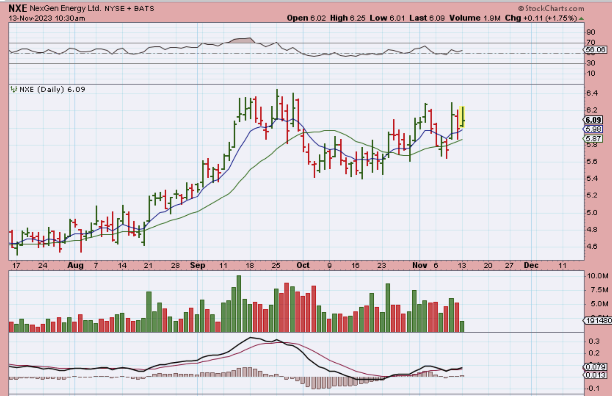I grabbed this chart of NXE as it popped higher and pulled back. NexGen Energy looks to be forming a bullish cup that will break out higher. It closed higher at $6.14.