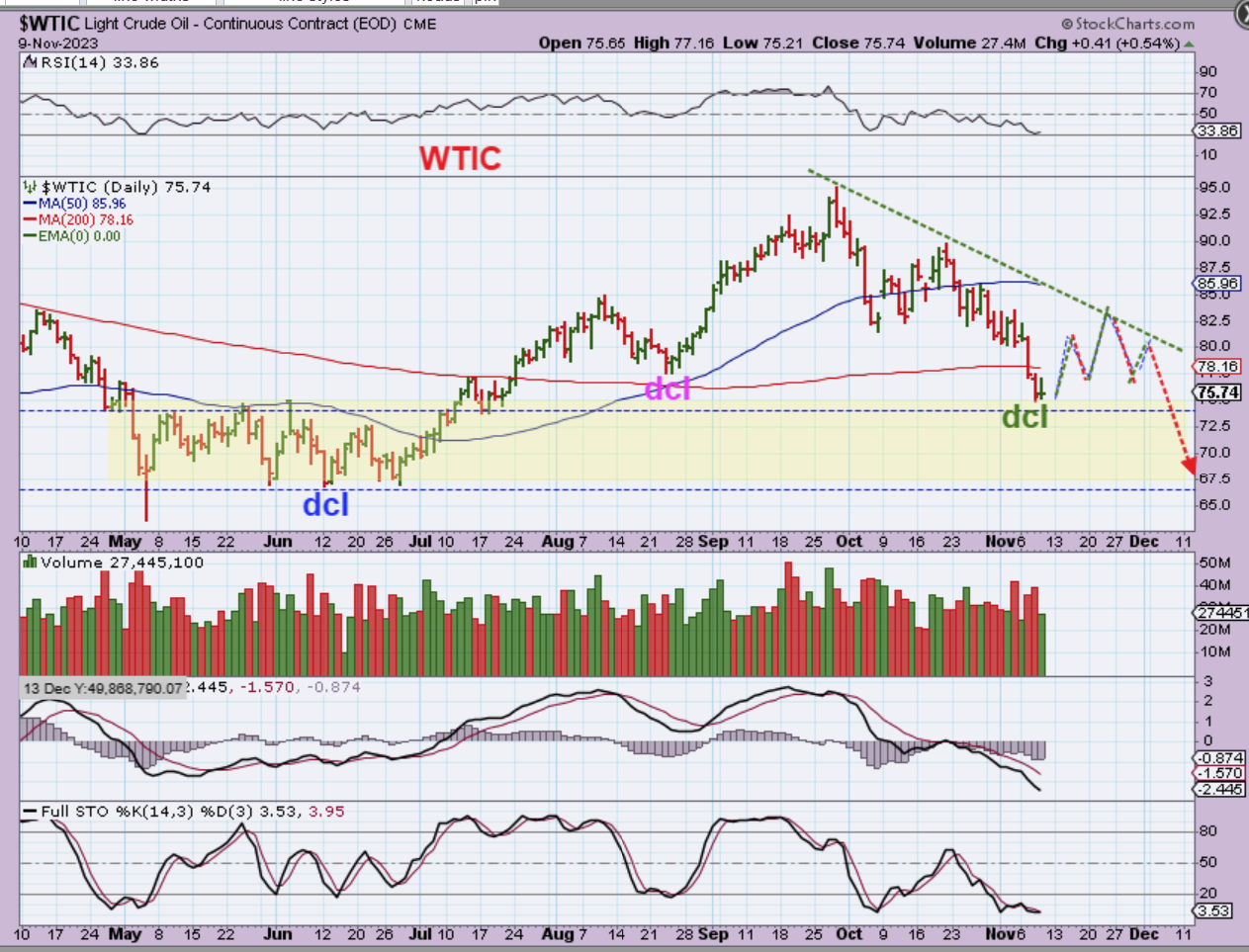 LAST WEEK I mentioned with this chart for The WTIC that I now suspect that Oil has put in the dcl on day 54, with a slight break of the 200sma. This COULD be an ICL, but I am thinking that we still have one more daily cycle lower to drop into the ICL, so I drew in a small bounce and then a continuation lower.