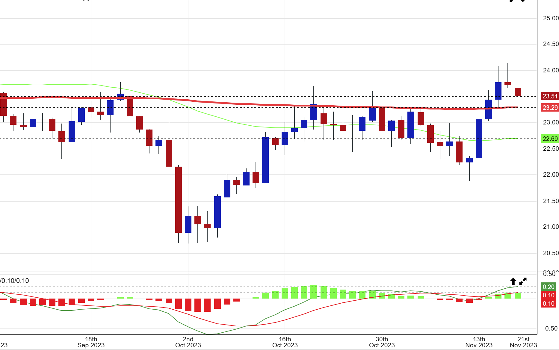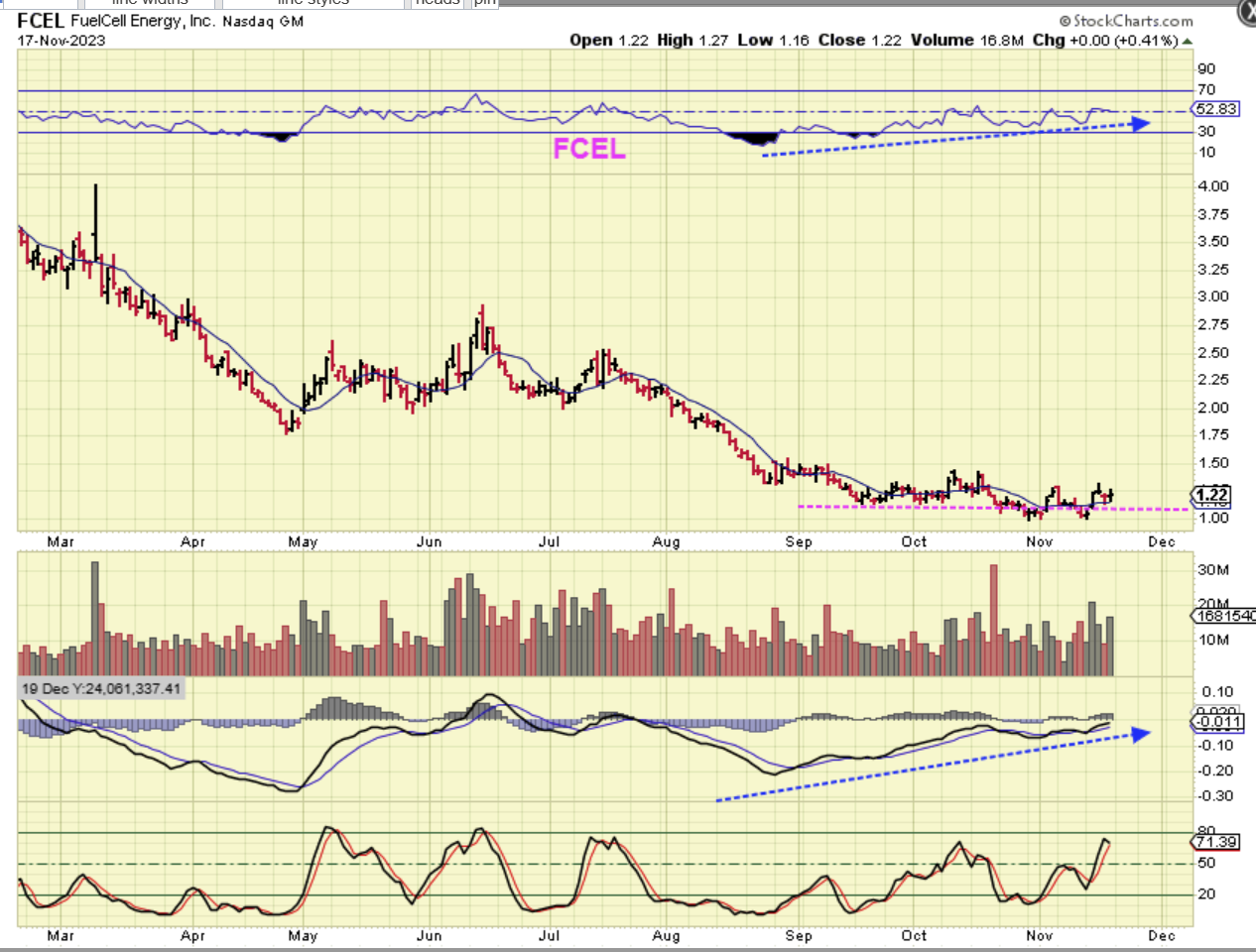 FCEL – This is a chart that I grabbed on Nov 17, and it also looks to be bottoming. It is still in this rice area as it bottoms out. The RSI & MACD are rising, so this could be a buy and hold. Start small? Check thier cash on hand holdings?  We honestly cannot tell when a stock under $5 is going to do the\dreaded public offering.