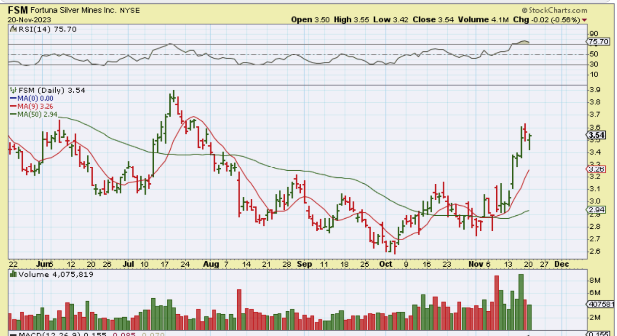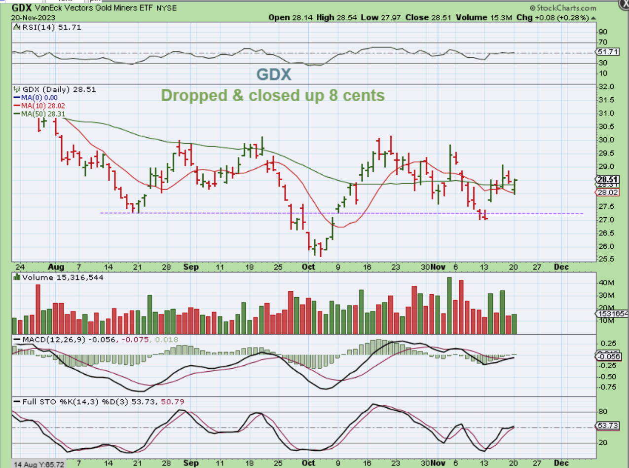 CDE – I noticed that by 10 a.m. some of the miners, especially the silver Miners, were turning green, so I captured this chart of CDE. It was up 2.38% already ( & it closed that way).