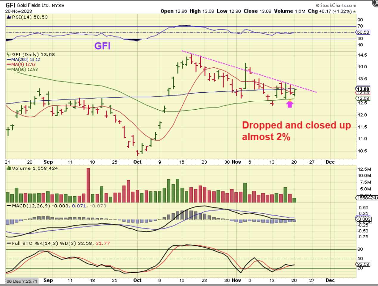 GFI dropped and then closed up 17 cents or over 1%. It is holding support at the 50smaand may be ready to break back above the 200sma and downtrend line. When I wrote that it closed up almost 2%, I think I saw that as 1.82%.