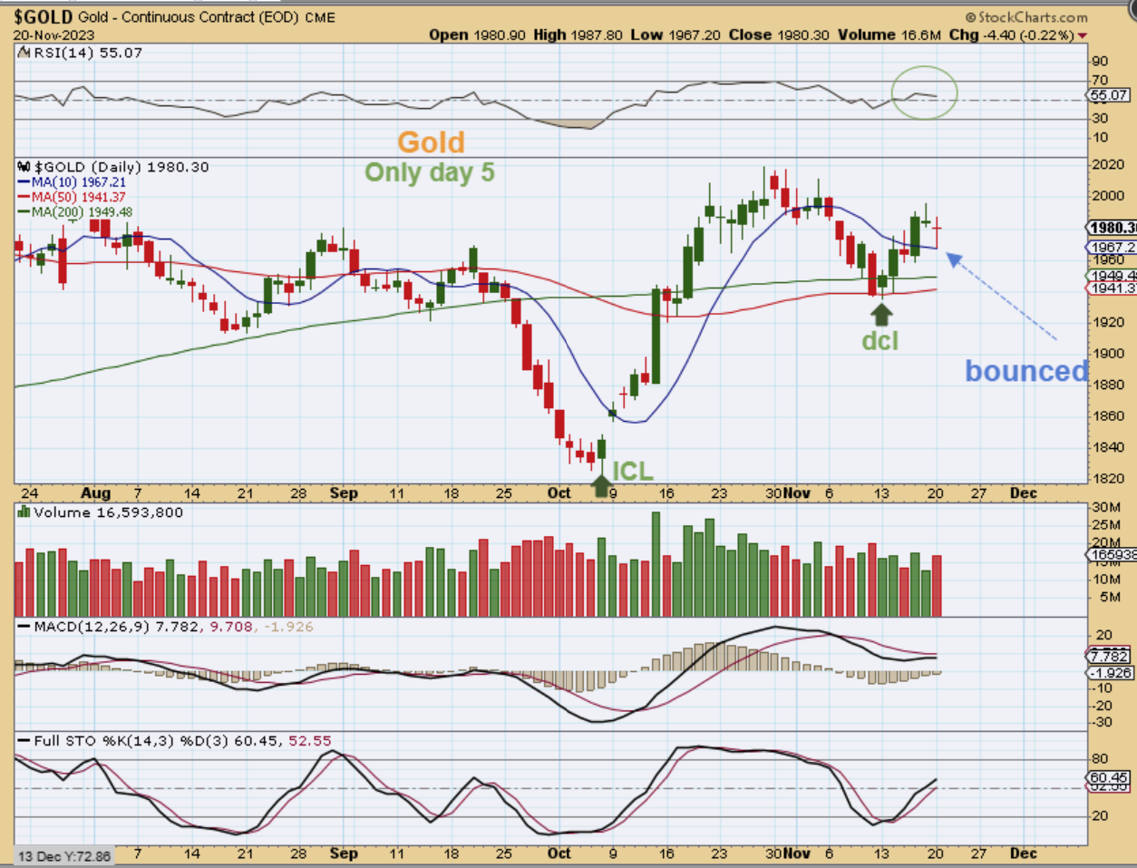 GOLD dropped and bounced off of the 10sma yesterday. This is still only day 5 out of the dcl, and this is bullish price action in the second daily cycle.