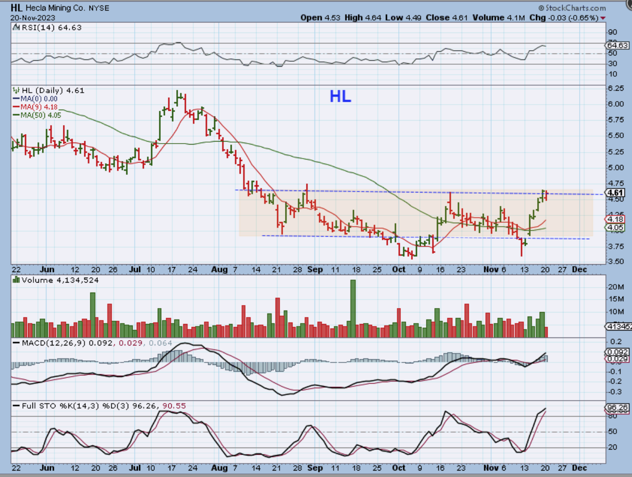 HL is trying to break free from a base. I honestly feel that when we look back at these Miners in a few weeks, we should see them back at the recent highs or better.  Think about this: In just 5 days HL ran from roughly under $3.75 to $4.75.  Buy & Hold rather than trading in and out is paying off again.