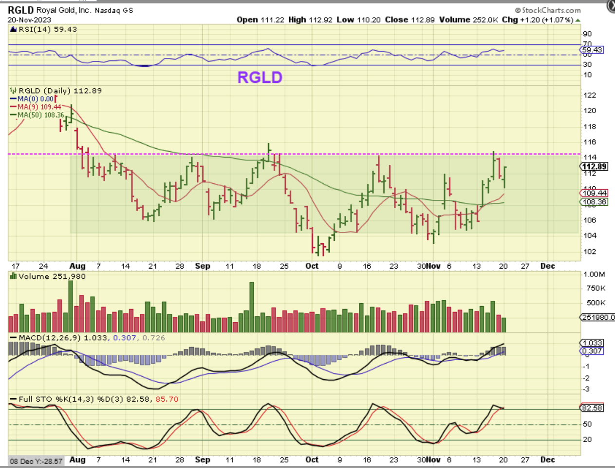 RGLD is a royalty Company that I mentioned as looking to have bottomed recently. It dropped toward the 9sma and then reversed, closing up over 1%. It is still inside of this large base, but it does look ready to breakout soon.