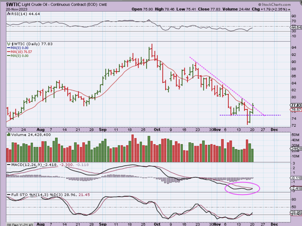 WTIC is due for a dcl, and this also may be an ICL. At this point that reversal low could be bought, if you wanted to trade this sector. A close above the downtrend line and MACD cross higher is further confirmation that the lows are in place. Oil stocks like MRO , VLO, etc are also near their recent lows.