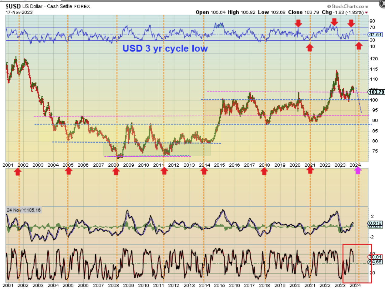 And again, THIS is the USD 3 yr cycle low expectations that I posted on Nov 17th. A drop like this really should help Gold, Silver, Miners, as well as possibly Bitcoin and the General Markets.