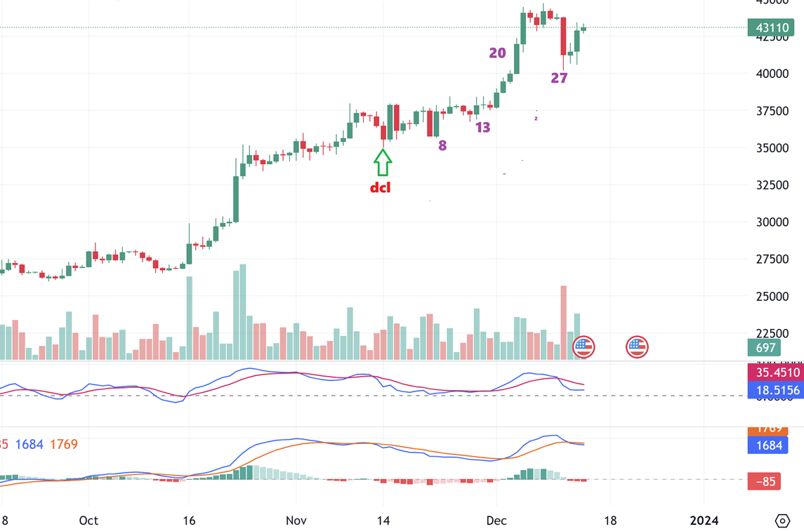 BITCOIN – I have been showing the count for Bitcoin and mentioned that I look for dips at 30 & 60 day intervals ROUGHLY. Our day 27 could have been the low and I drew that in a chart- that bitcoin might just move higher from there, and so far it has. Bitcoin had a Fed Pop too. So…