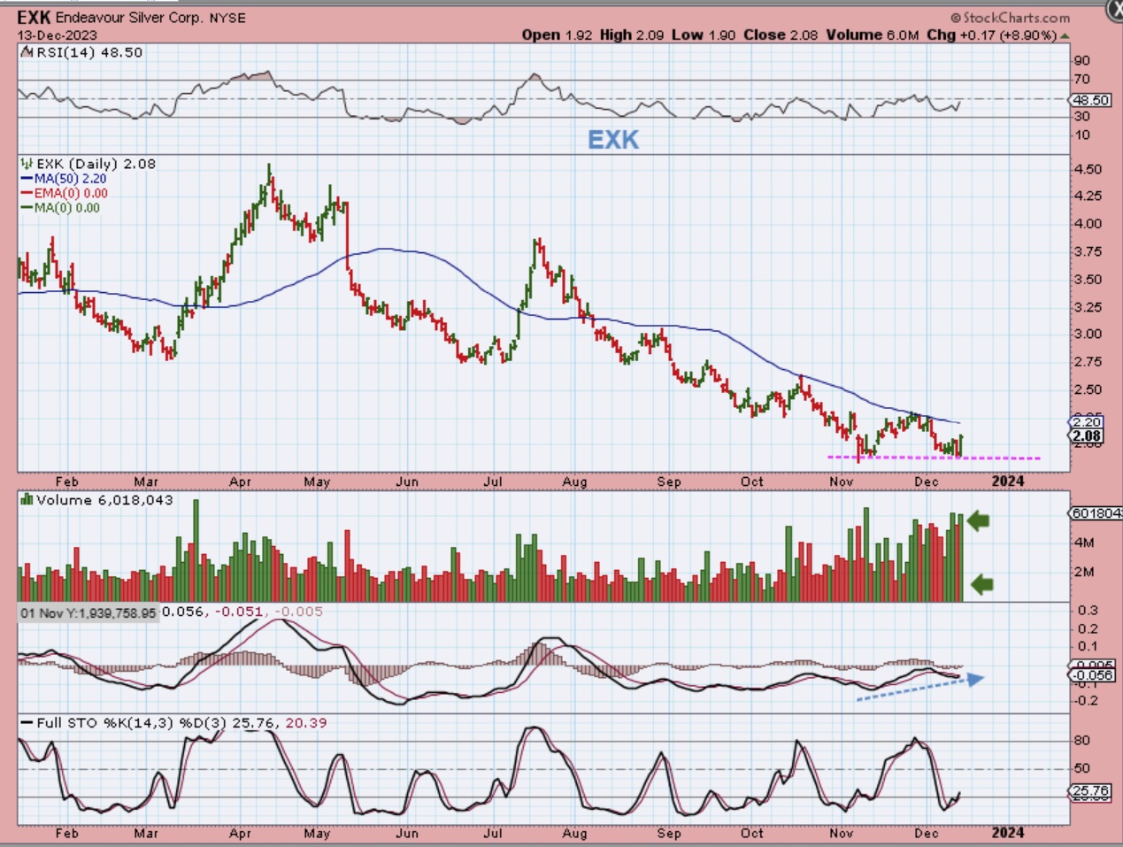 EXK is a double bottom at the lows. I actually pointed EXK out as Silver was selling off for 7 days. I questioned why it looked bullish and is NOT selling off with Silver. This is EXK popping 9% higher yesterday, but it is still at the lows and can be bought as a lagger with a stop under yesterdays lows.