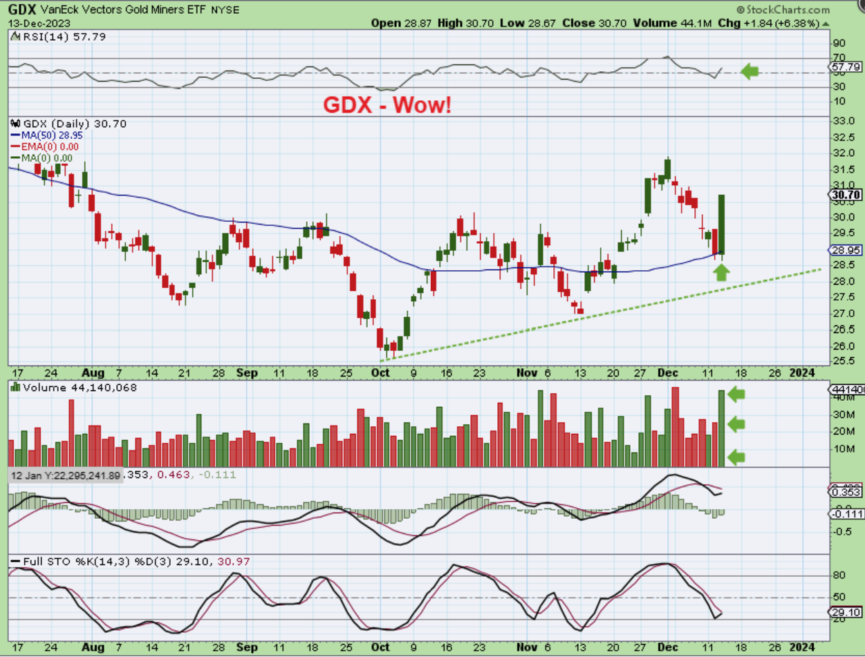 Silver (SLV here) surged too and we have higher lows here too, even after that relentless selling that we saw all week. This was a 7 or 8 day sell off that was followed by a very bullish strong reversal candle. Silver stocks did NOT sell off with Silver, and that was being pointed out over the past few days. This obviously made Silver stocks and Gold Miners a buy.