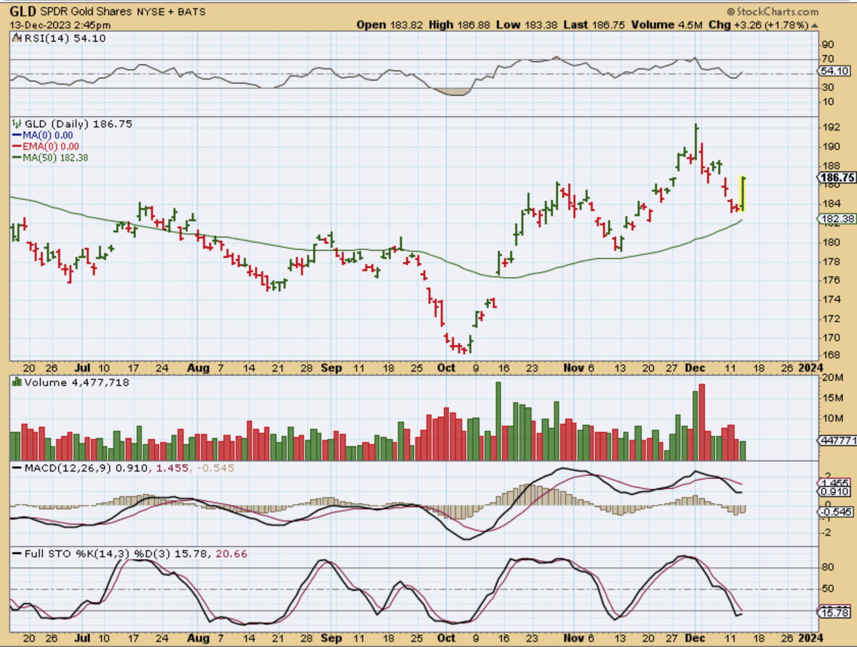 Stock charts doesn’t show GOLD accurately, so I grabbed the chart of its representative GLD. With the Fed decision and the speech discussing inflation becoming tamer and rate hikes likely done for now, we have a strong burst higher. Is that an early dcl or one long daily cycle of 47 days? It really doesn’t matter, either way this is very bullish and remains right translated as a 47 day first daily cycle or a short day 22 dcl with a day 15 peak.