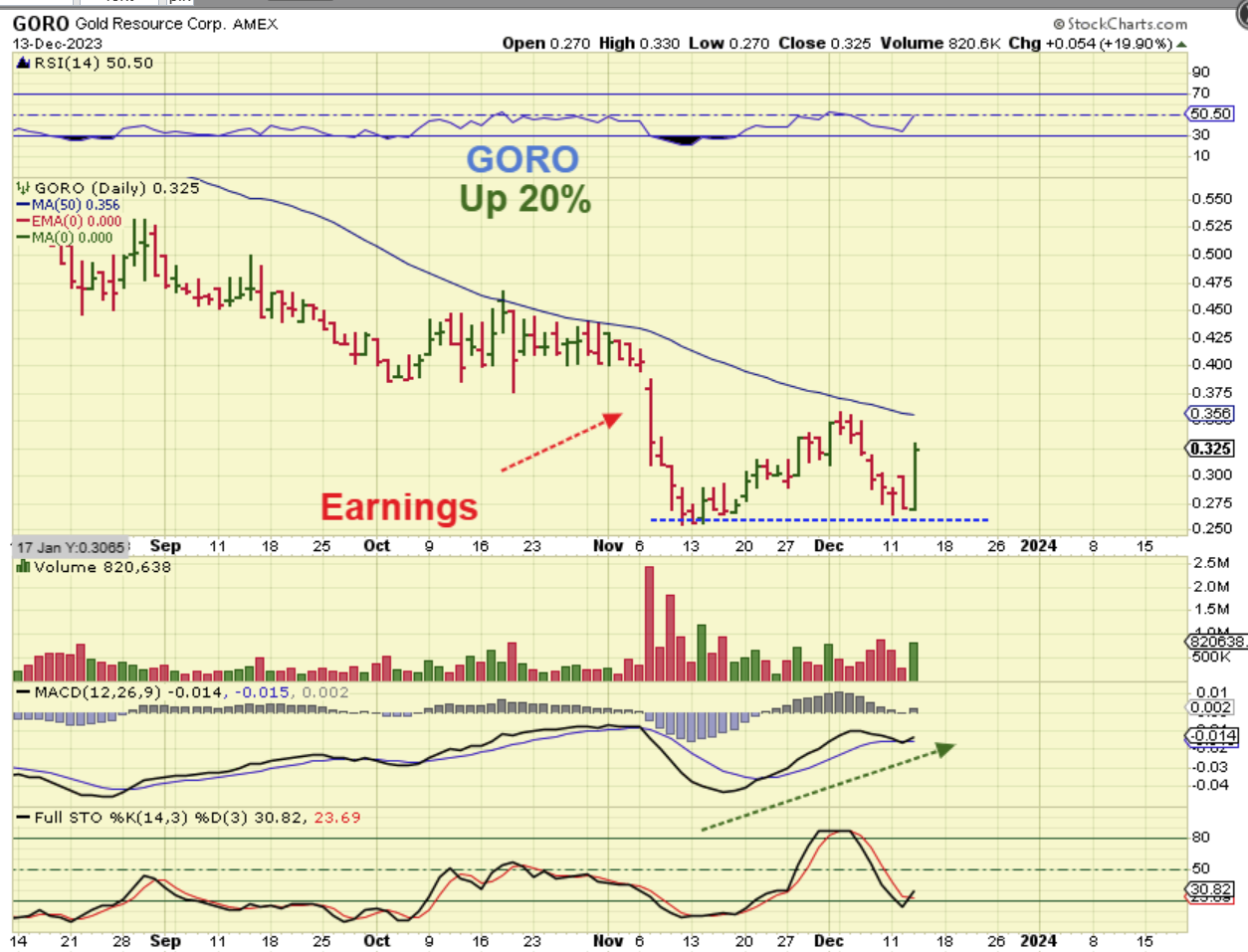 GORO was up 20% and to be honest, this is probably just getting going, since it crashed with earnings and based out for a month.