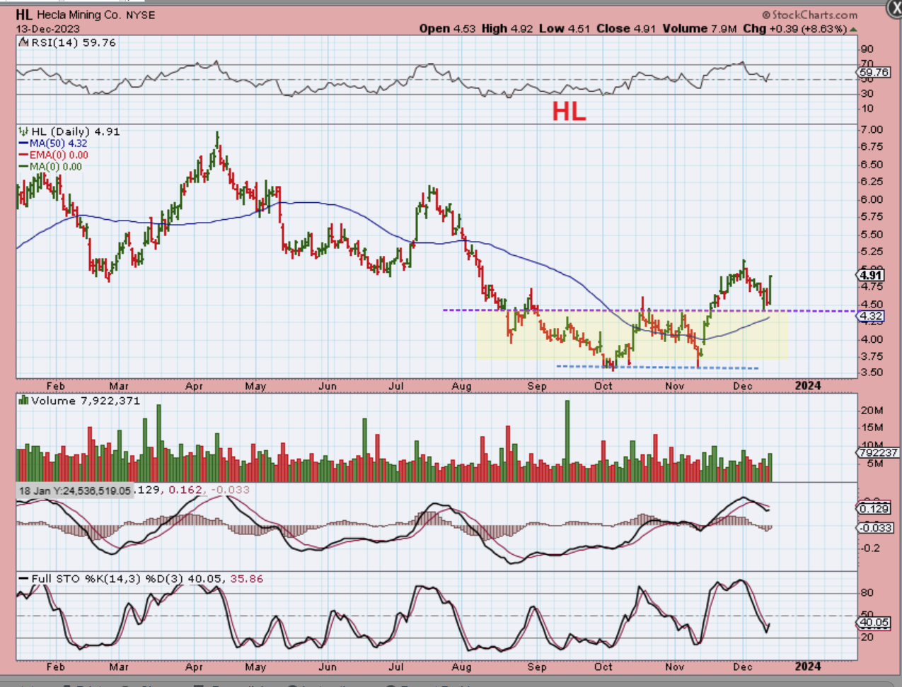 HL has a double bottom low and it broke out and back tested that area as silver sold off relentlessly. It was up 8% yesterday and is a buy too.