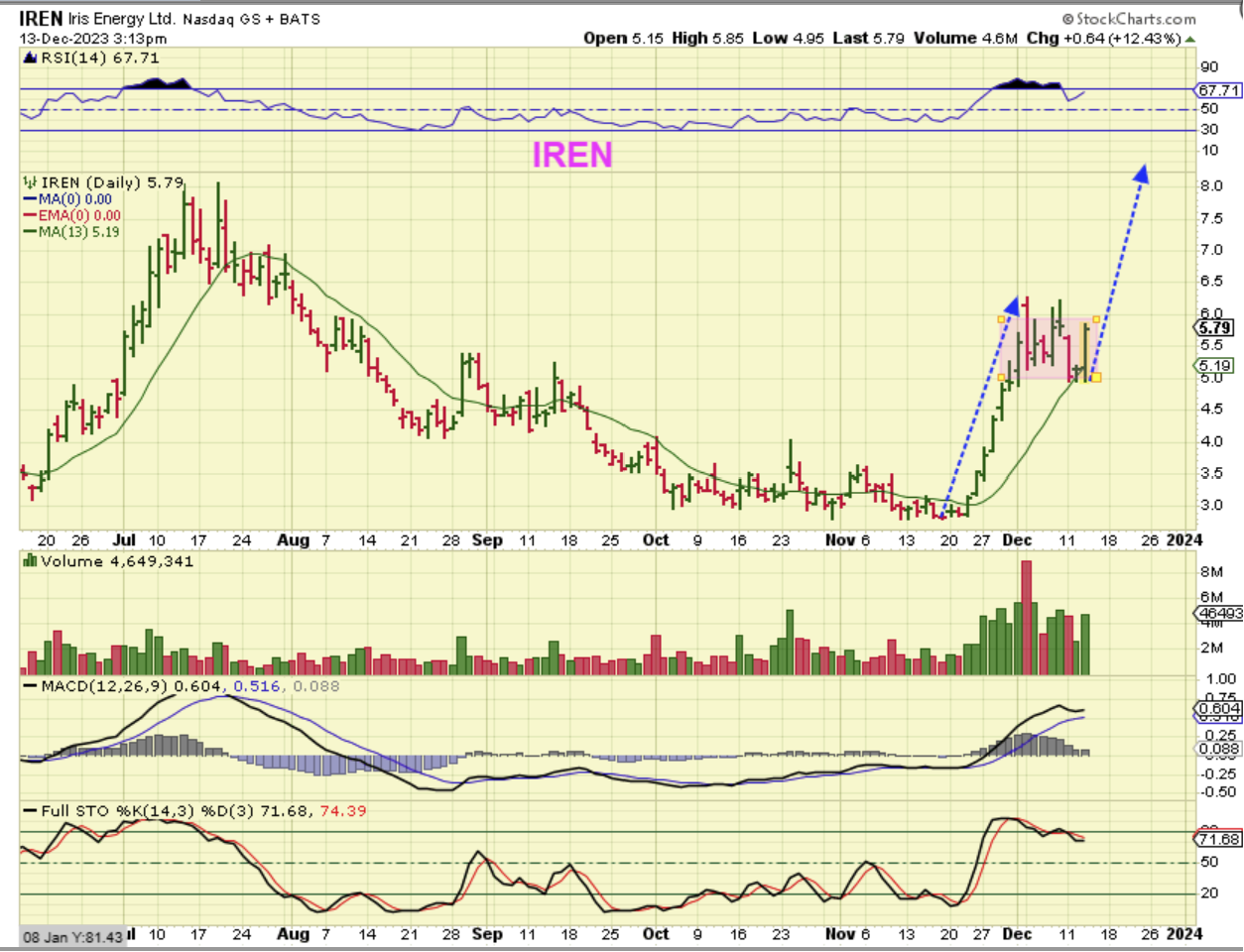 IREN popped post Fed, and this was after his speech at 3:13. This could be a consolidation box that becomes a mid-point area to the move. That would project almost another 80% move or so in Iren. Having this in your basket from the $3 base area is paying off fast (but it is a very choppy difficult ride too).