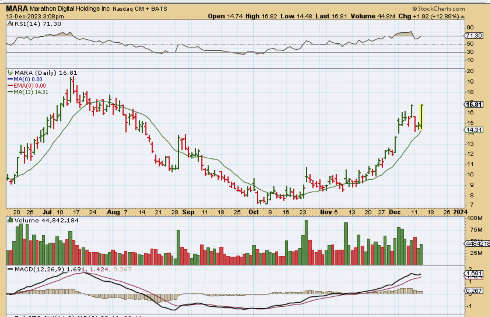 Doesn’t RIOT look like a bullish Bull Flag? That could be the midpoint run too. I do think that these will go MUCH higher in 2024, but for now they are also making excellent gains. At the last halving year of 2020, MARA and RIOT both traded north of $75 and they can go right back up there over time.