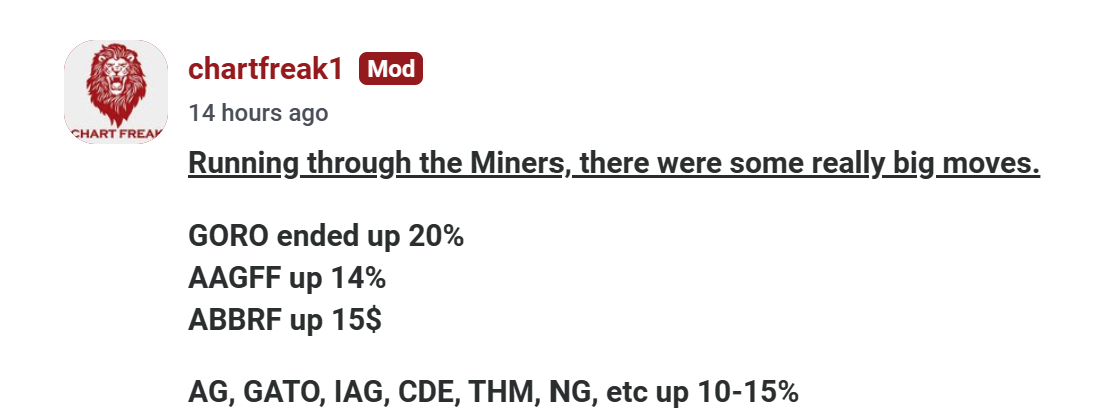 AG shot up 6% right after the Fed Mtg, so I posted this and mentioned some of the others. We saw buying after that Fed Decision that lasted right through his speech.