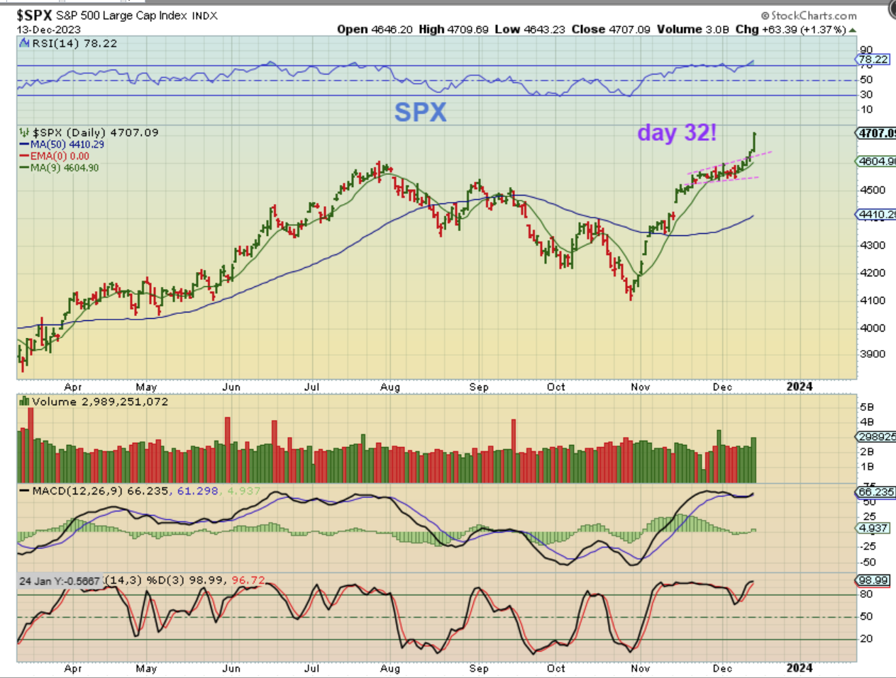 THE SPX DAY 32! The SPX was up 63 points and has a solid breakout from a consolidation pattern. We are still going to be due for a dcl at any time, so we’ll see how this plays out, but again, this will be a buy the dip pull back! Money could just keep flooding in for a few more days and push this higher, but with a dcl coming due, how might this dip?